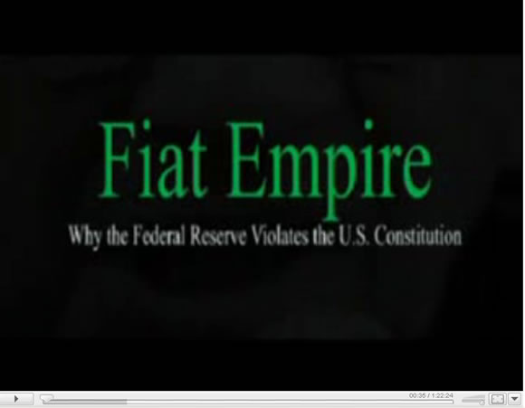 As a public service, you can watch FIAT EMPIRE for free on Google Video. If you get something out of it, please purchase a DVD below. The DVD is much clearer and includes an additional 120 minutes of interviews of the experts interviewed in the film. Refer others to the DVD as well as this website (such being www.FiatEmpire.com or at the mirror site at www.mecfilms.com/fiat in the even the main site is ever shut down). Purchases of FIAT EMPIRE are going into our new documentary, ORIGINAL INTENT, now in production. ORIGINAL INTENT features Ron Paul, Pat Buchanan, G. Edward Griffin, Edwin Vieira and others. Use your FIAT EMPIRE DVD to give screenings to your family, friends and associates or purchase FIAT EMPIRE in bulk quantities and hand them out. Your family, friends and associates will appreciate and thank you for the insights in FIAT EMPIRE and the books recommended at the end. Only an informed citizenry can safeguard against rogue politicians and a tyrannical government.