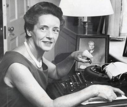 Eve Curie Labouisse, at her typewriter in Washington. (new york times file 1961)