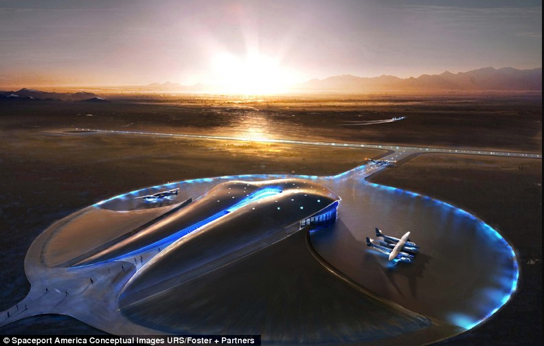 This conceptual image shows how Spaceport America is expected to look at completion in 2010. Called Spaceport America, the $200million taxpayer-funded project will launch spacecraft off the 10,000-foot runway attached to an aeroplane. The spacecraft will then break free and rocket 62 miles (100 kilometers) into space for a total of two hours including five minutes of weightlessness before coming back down to Earth. Read more: http://www.dailymail.co.uk/sciencetech/article-1194137/Out-world-New-Mexico-breaks-ground-construction-Virgin-spaceport.html#ixzz0bHfMESNu