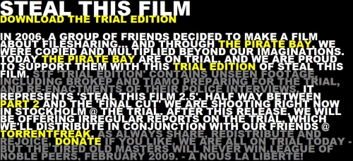 Steal This Film is a film series documenting the movement against intellectual property produced by The League of Noble Peers and released via the BitTorrent peer-to-peer protocol. Two parts, and one special The Pirate Bay trial edition of the first part, have been released so far, and The League of Noble Peers is working on "Steal this Film - The Movie" and a new project entitled "The Oil of the 21st Century". Boing Boing's Cory Doctorow called it 'an amazing, funny, enraging and inspiring documentary series'. This 'special edition' (also known as '2.5') was released to coincide with the trial in 2009 of The Pirate Bay. This version includes material from Steal This Film I and II combined with some new material shot with Peter Sunde and others during 2008. Steal This Film 'Spectrial Edition' is widely available online and it is thought to be this version that is now available to television stations and others. This new edition of Steal This Film is in part of the Official Selection and in competition at the 2009 Roma Fiction Festival (Factual strand).