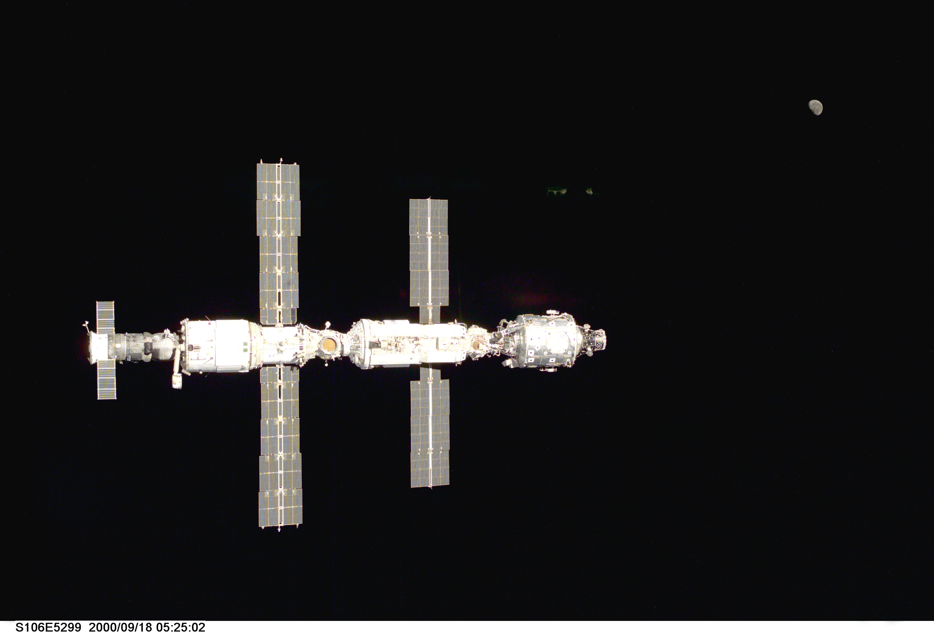 S106-E-5299 (18 September 2000) --- Backdropped against the blackness of space, the International Space Station (ISS) is seen following its undocking with the Space Shuttle Atlantis. After accomplishing all mission objectives in outfitting the station for the first resident crew, the seven astronauts and cosmonauts undocked at 3:46 (GMT) on Sept. 18 over Russia near the northeastern portion of Ukraine. When Atlantis was at a safe distance from the station, about 450 feet, astronaut Scott D. Altman, pilot, performed a 90-minute, double-loop fly around to enable the crew to document the station’s exterior. He fired Atlantis’ jets one final time to separate from the station at 5:35 GMT, September 18.