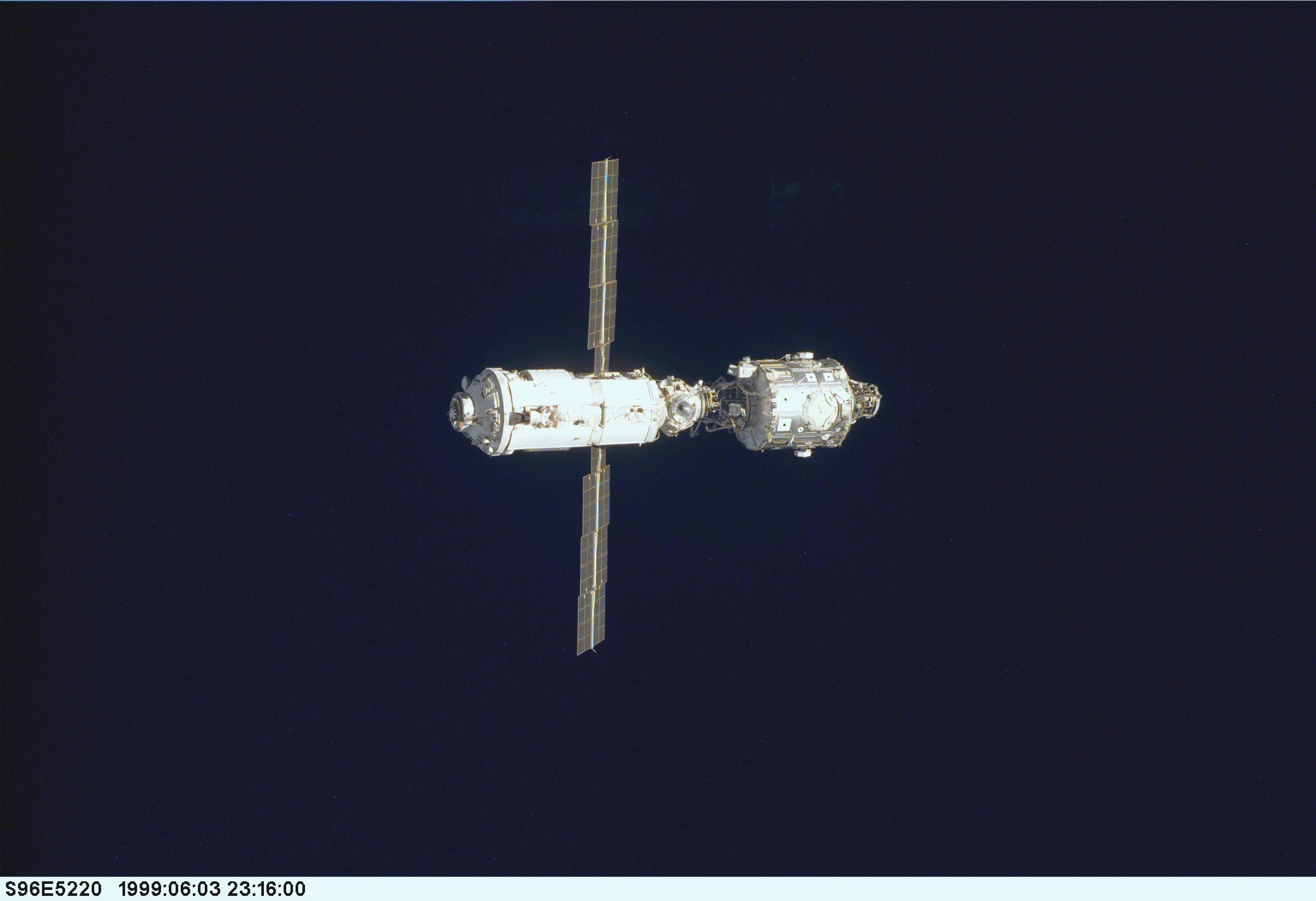 STS096-E-5220 (03 June 1999) --- The International Space Station (ISS), including the elements of the Zarya module and the Unity node, centered in a setting of total black, as photographed from the Space Shuttle Discovery. The scene was recorded with an electronic still camera (ESC) at 23:16:00 GMT, June 3, 1999.