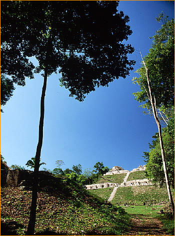 Located in what is today southwestern Belize, Caracol, Spanish for "snail," rivaled anything in Belize today. At its peak between A.D. 650 and 700, the city had a population estimated at 150,000 (Belize's entire population is only about 50,000 more than this today). Caracol's largest structure, the 138-foot Caana (Sky Place), is the tallest building in either ancient or modern Belize. All told, in its prime, the site covered almost 15 square miles, had more than 36,000 occupied buildings, and included over 22 miles of sacheoh, or "white roads," made of blocks topped with crushed stone and plastered. A tomb found beneath a bench in the front room of Structure A3, a temple rising 52 feet above the Main Plaza, contained a single skeleton with 18 pounds of obsidian and 88 pounds of chert.