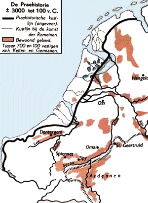 approx. 100 BC - Germanic tribes, previously nomads, settle in the Low Countries. Along the coast "Kananefaten", "Tubanten" in the east, "Bataven" along the rivers, and "Friezen" in the west/ north of the country