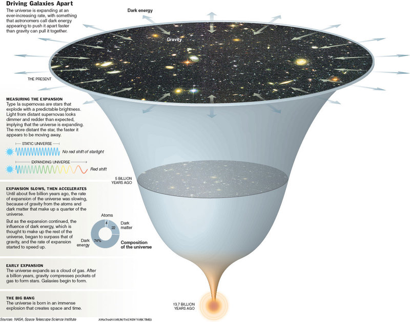 Through myriad techniques and observations, cosmologists have recently arrived, after decades of strife, at a robust but dark consensus regarding a cosmos in which stars and galaxies, as well as the humans who gawk at them, amount to barely more than a disputatious froth. It was born 13.7 billion years ago in the Big Bang. By weight it is 4 percent atoms and 22 percent so-called dark matter of unknown identity — perhaps elementary particles that will be discovered at the Large Hadron Collider starting up outside Geneva this year. That leaves 74 percent for the weight of whatever began causing the cosmos to accelerate about five billion years ago.