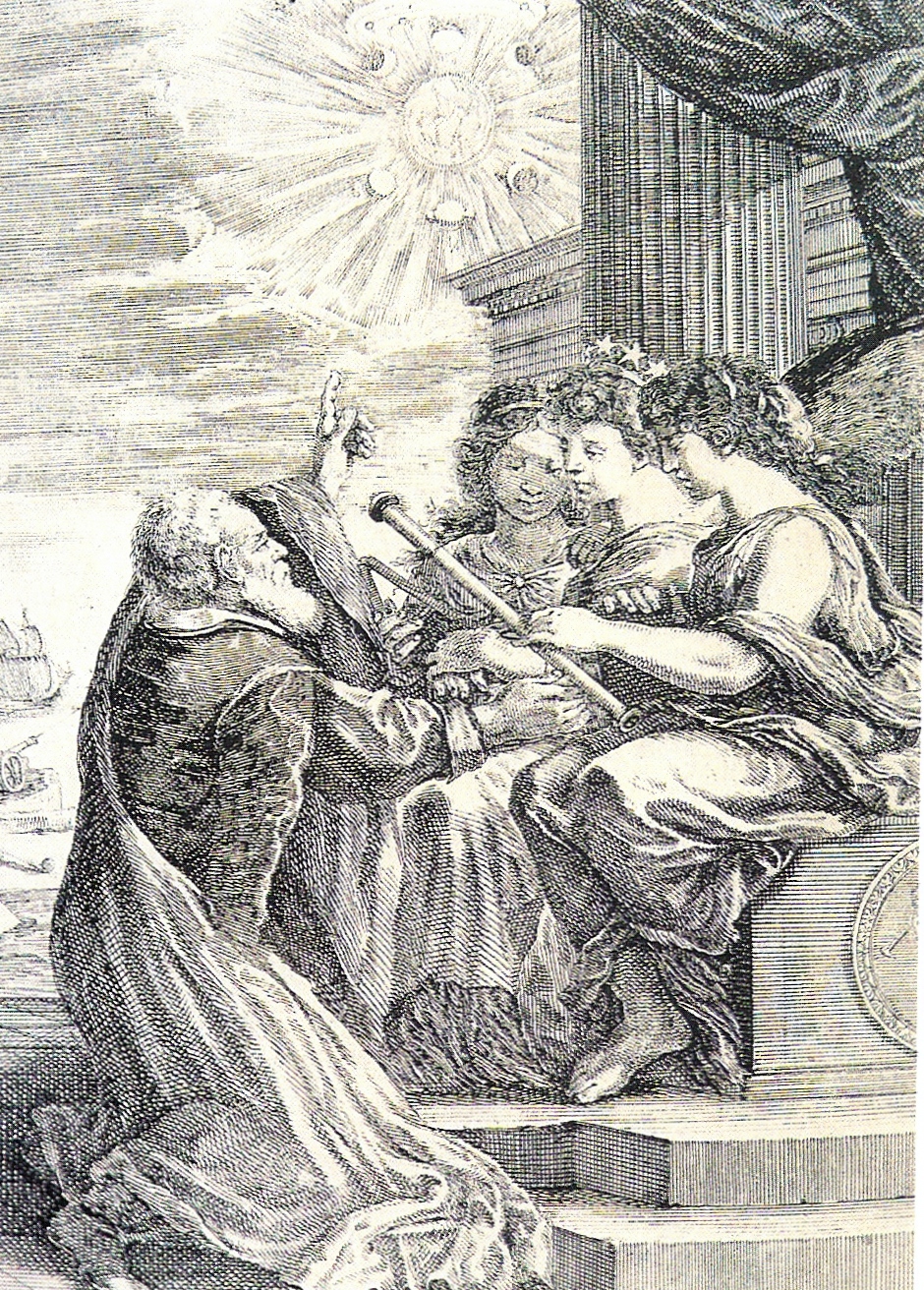 Galileo Galilei showing medicean planets. Optics, Astronomy and Mathematics. Published in Opere, Bologna, 1656.