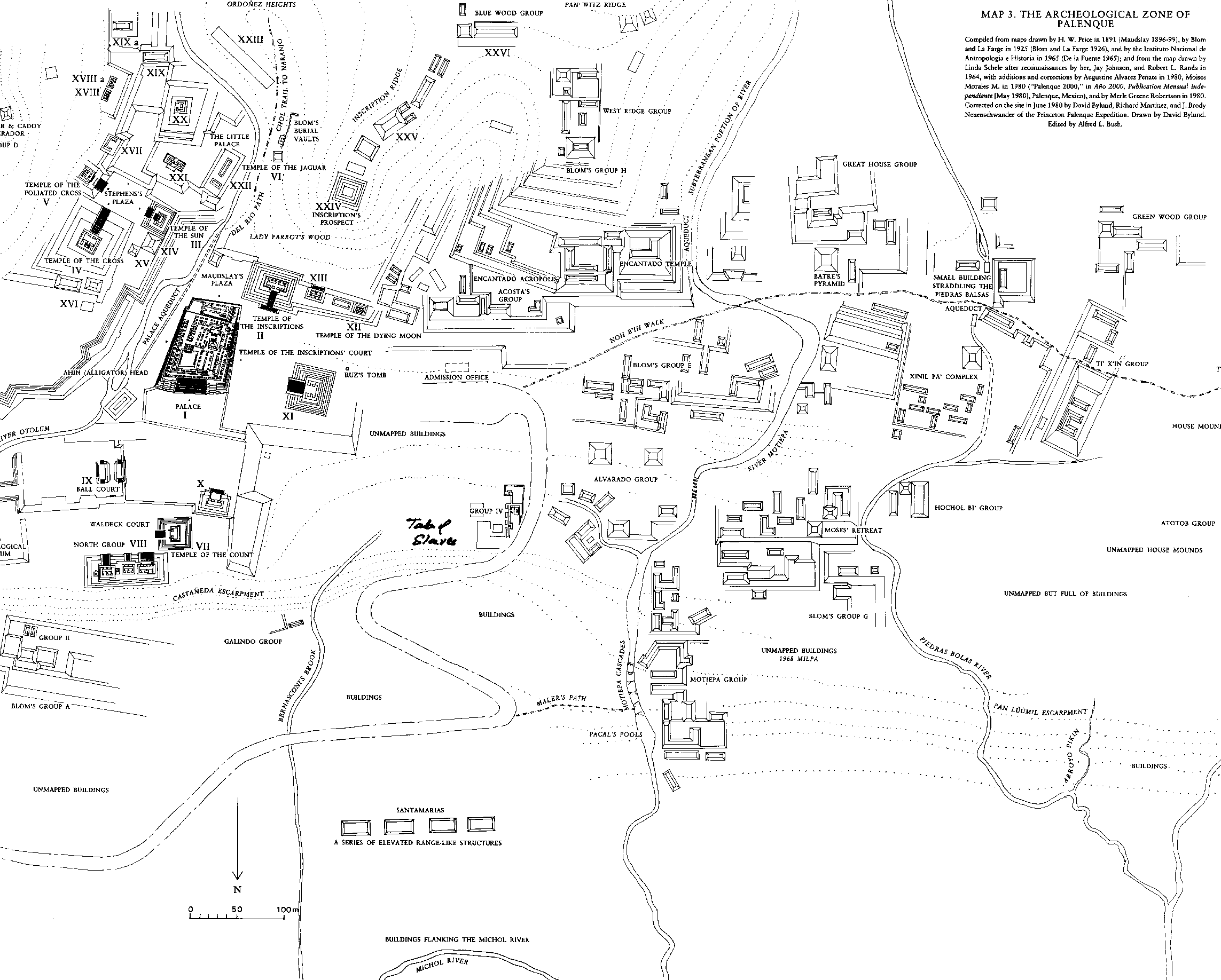 This map of Palenque originally appeared in The Sculpture of Palenque, Volume 1 by Merle Greene Robertson. (Note Dr. Robertson's penciled instructions for the 1997 National Geographic restoration drawing). North is down.