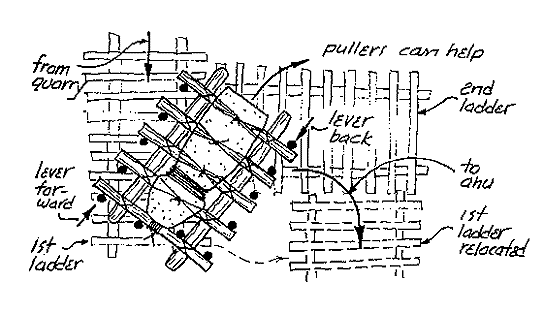 As critical as the force urging the sled forward is the frictional force holding it back, and every effort to smooth and grease the contact surfaces reduces the required crew size. All lashings have to be neatly done and recessed or otherwise prevented from hanging up, and the sled runners need to be beveled at both ends to ride smoothly onto the sliders before and after the required 180-degree rotation of the moai. One would rotate the sled with this system much as one would rotate a rowboat or canoe, by levering one side forward and the other back. It is important that the sled runners not get parallel to the sliders and fall into the gaps between them, though levering forward onto ladders set 90 degrees from one another avoids the problem. See documentary Easter Island (2000).
