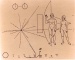 The Pioneer F spacecraft, destined to be the first man made object to escape from the solar system into interstellar space, carries this pictorial plaque. It is designed to show scientifically educated inhabitants of some other star system, who might intercept it millions of years from now, when Pioneer was launched, from where, and by what kind of beings. (Hopefully, any aliens reading the plaque will not use this knowledge to immediately invade Earth.) The design is etched into a 6 inch by 9 inch gold-anodized aluminum plate, attached to the spacecraft's attenna support struts in a position to help shield it from erosion by interstellar dust. The radiating lines at left represents the positions of 14 pulsars, a cosmic source of radio energy, arranged to indicate our sun as the home star of our civilization. The "1-" symbols at the ends of the lines are binary numbers that represent the frequencies of these pulsars at the time of launch of Pioneer F relative of that to the hydrogen atom shown at the upper left with a "1" unity symbol. The hydrogen atom is thus used as a "universal clock," and the regular decrease in the frequencies of the pulsars will enable another civilization to determine the time that has elapsed since Pioneer F was launched. The hydrogen is also used as a "universal yardstick" for sizing the human figures and outline of the spacecraft shown on the right. The hydrogen wavelength, about 8 inches, multiplied by the binary number representing "8" shown next to the woman gives her height, 64 inches. The figures represent the type of creature that created Pioneer. The man's hand is raised in a gesture of good will. Across the bottom are the planets, ranging outward from the Sun, with the spacecraft trajectory arching away from Earth, passing Mars, and swinging by Jupiter.