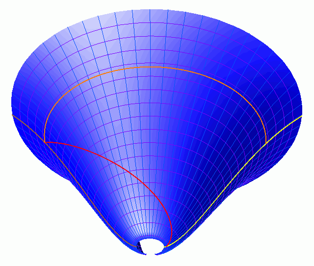 Euclidean embedding of a part of the Lambda-CDM spacetime geometry, showing the Milky Way (brown), a quasar at redshift z = 6.4 (yellow), light from the quasar reaching the Earth after approximately 12 billion years (red), and the present-era metric distance to the quasar of approximately 28 billion light years (orange). Lines of latitude (purple) are lines of constant cosmological time, spaced by 1 billion years; lines of longitude (cyan) are world lines of objects moving with the Hubble flow, spaced by 1 billion light years in the present era (less in the past and more in the future).